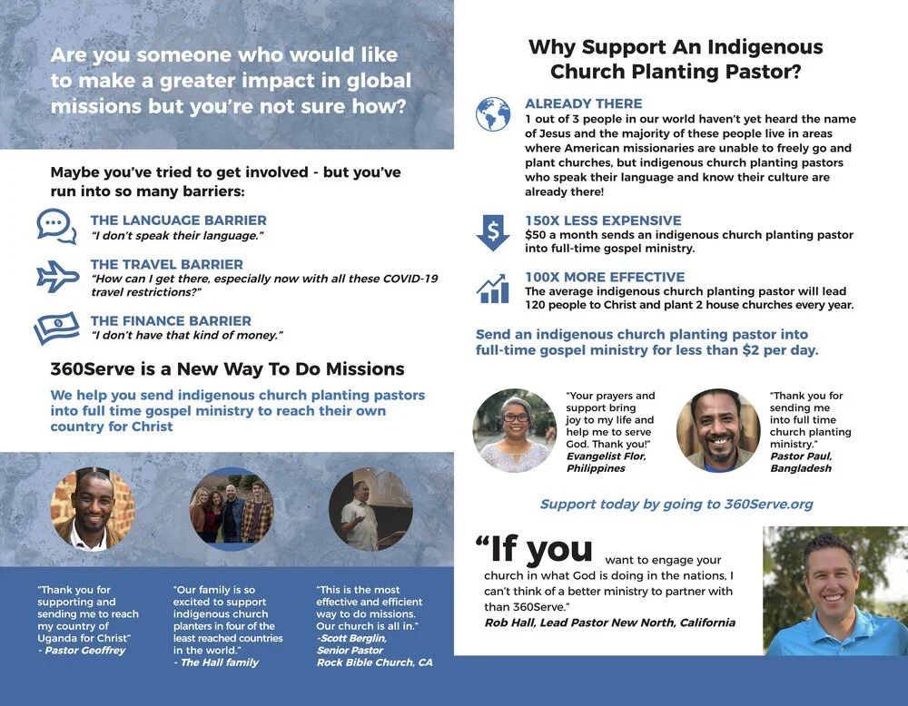 “360Serve is our global missions partner that helps our church support indigenous church planting pastors who evangelize and plant churches in the least reached areas of the world in fulfillment of the Great Commission.”